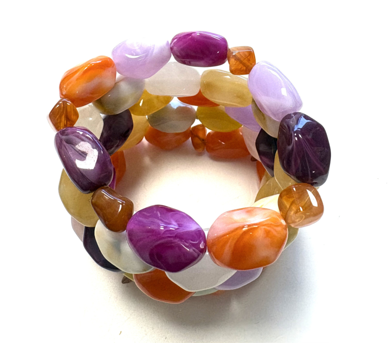 Armband grote acryl kralen oranje/geel/paars