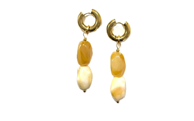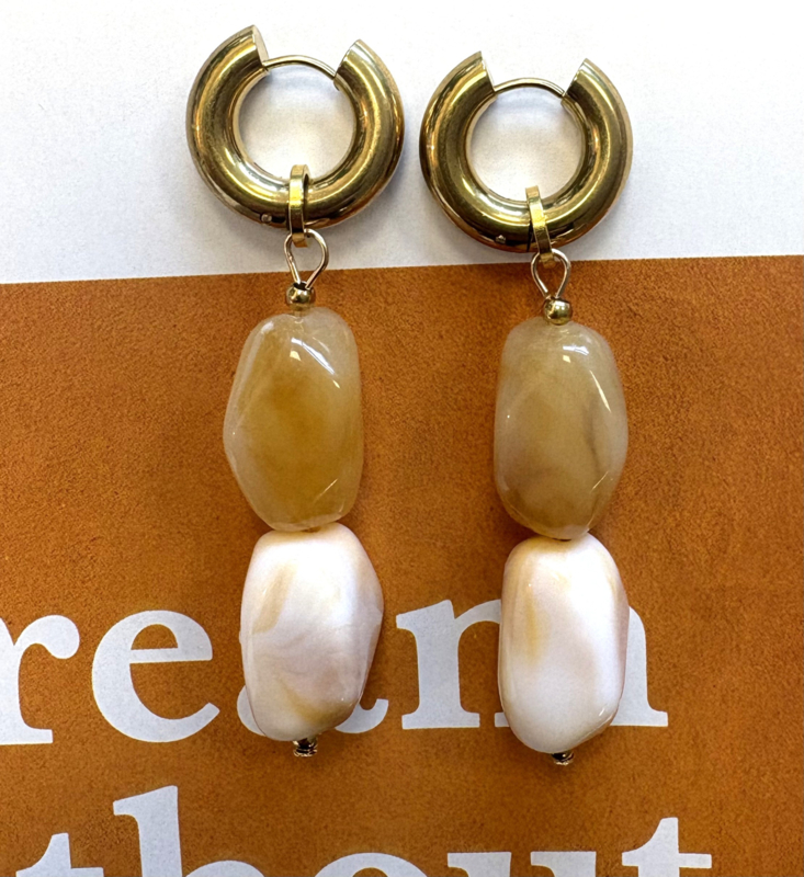 Stainless steel gouden oorringen van ongeveer 2cm doorsnee met roomwit en beige acryl kralen. Acryl is lichtgewicht en kleurbestendig. Totale lengte is ongeveer 7cm.