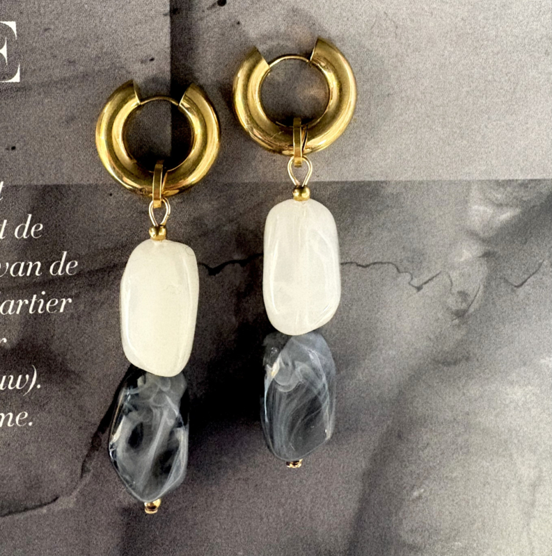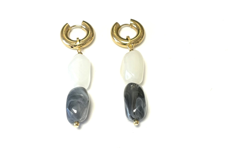 Stainless steel gouden oorringen van ongeveer 2cm doorsnee met grijze en witte acryl kralen. Acryl is lichtgewicht en kleurbestendig. Totale lengte is ongeveer 7cm.