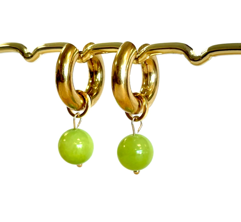 Prachtige stainless steel gouden oorringen (20mm x 4m) met hanger van licht groene topaz (10mm)
