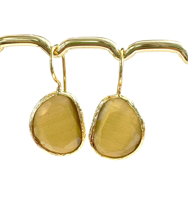 Deze oorbellen worden gemaakt in samenwerking met een klein zilversmid atelier in Istanbul door gekwalificeerde vakmensen. Deze oorbellen zijn gemaakt van 22 karaat verguld messing met een mosterdgele cateye steen.