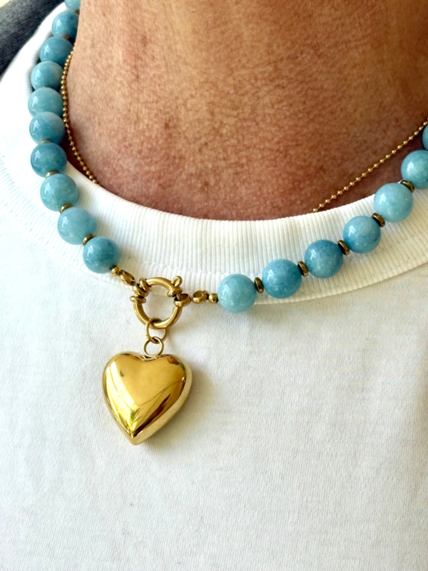 Ketting met 10mm kralen van blauwe jade met gouden hart en kleine gouden hematite kraaltjes. De ketting is ongeveer 45cm lang en sluit met gouden stainless steel slot.