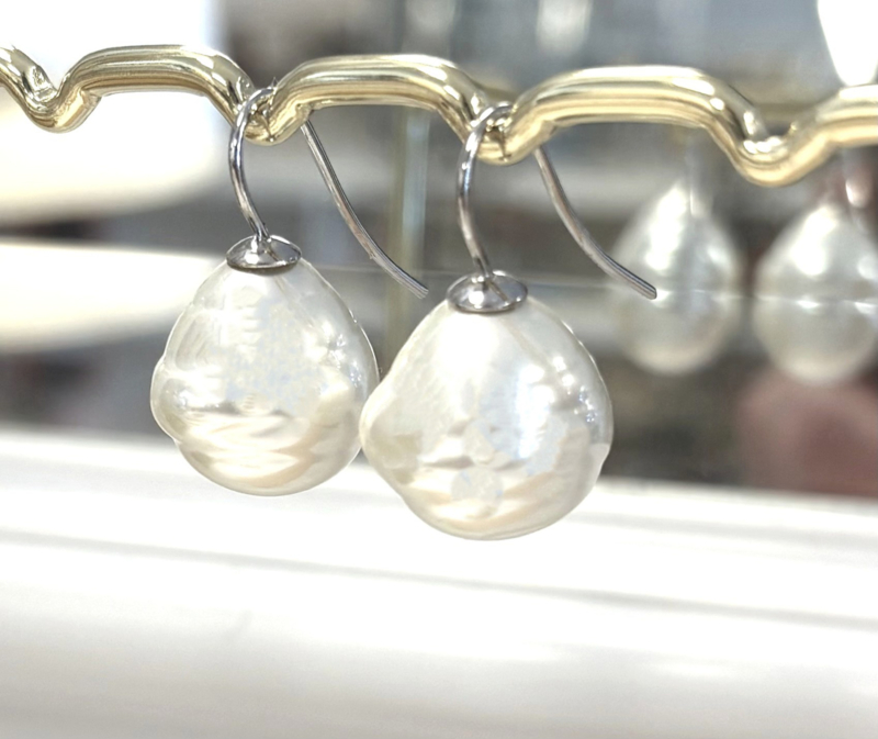 Witte barok parel oorbellen. Parels zijn ongeveer 1,6 cm lang. Zilverkleurige oorstekers, anti-allergisch en nikkelvrij. Totale lengte 2,6 cm