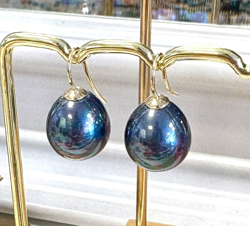Klassieke pareloorbellen in de kleur pacific blue met gouden rodium steker. Deze oorbellen zijn anti-allergisch en van een zeer mooie kwaliteit. De parel is 1,5cm lang. Totale lengte is 2,4cm.
