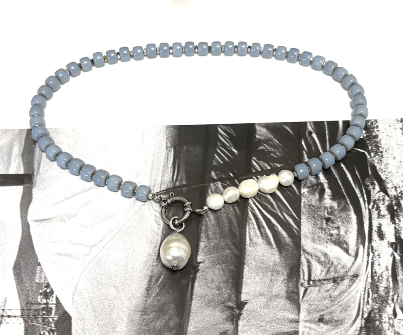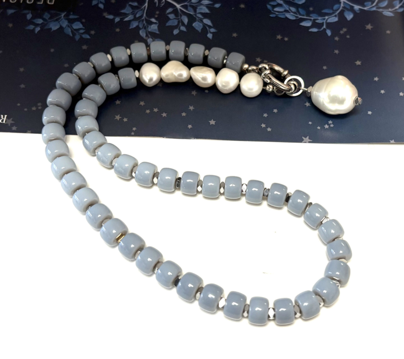Necklace glass beads gray and pearls