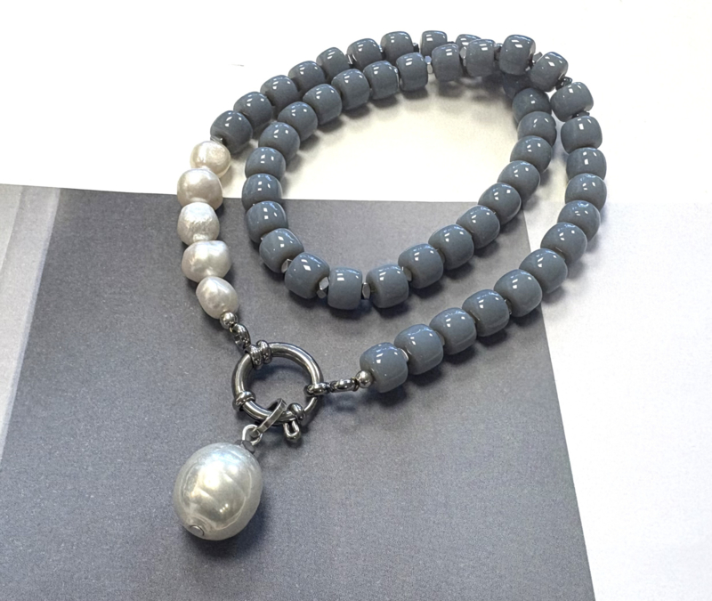 Necklace with gray glass beads, silver hematite beads, and freshwater pearls. Pendant with a large Mallorca pearl. Total length approximately 48cm.