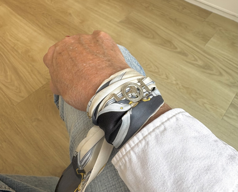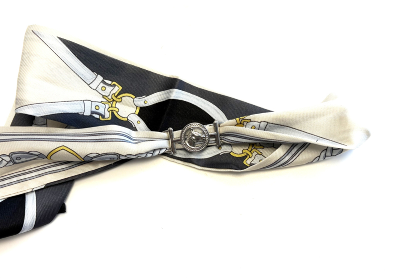 This small Hermes-style scarf is 88cm long and wraps around your wrist, tying it in a knot. A silver-colored decorative buckle with a horse's head emblem transforms the scarf into a stylish bracelet.