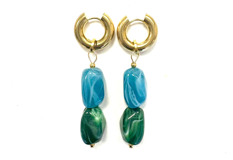 Stainless steel gold earrings, approximately 2cm in diameter, with green and blue acrylic beads. Acrylic is lightweight and fade-resistant. Total length is approximately 7cm.