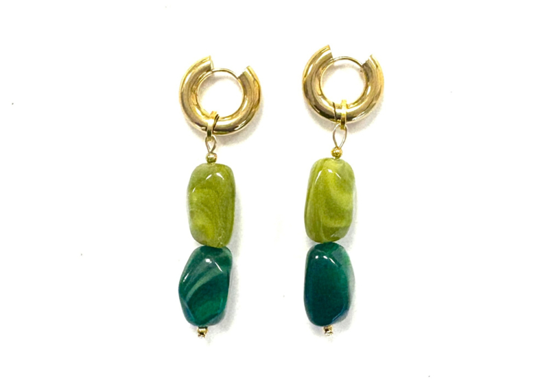 Stainless steel gold earrings, approximately 2cm in diameter, with light green and green acrylic beads. The acrylic is lightweight and fade-resistant. Total length is approximately 7cm.