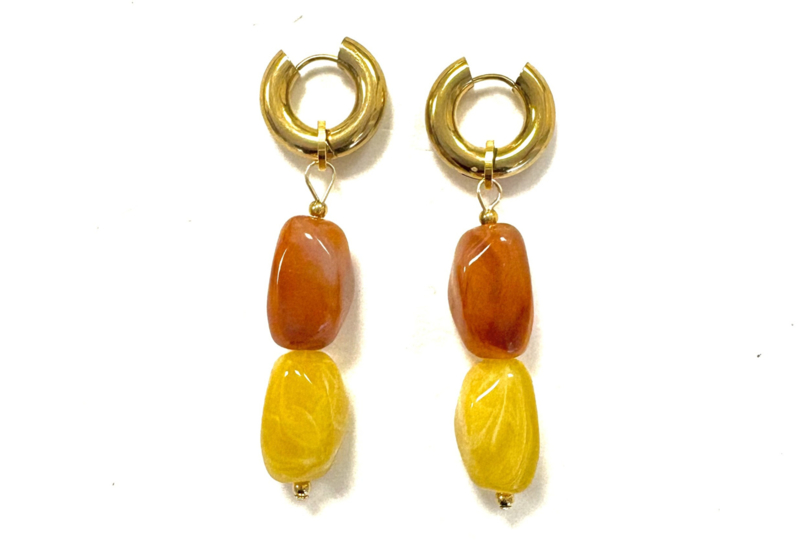 Stainless steel gold earrings, approximately 2cm in diameter, with yellow and cognac acrylic beads. Acrylic is lightweight and fade-resistant. Total length is approximately 7cm.
